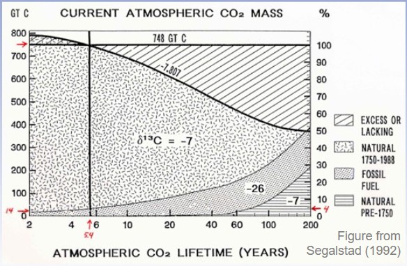 Úgy a radioaktív, mint a stabil szénizotópok azt mutatják, hogy a légköri CO2 valós tartózkodási ideje (élettartama) csak körülbelül 5 év, és hogy a fosszilis tüzelőanyagokból származó CO2 mennyisége a légkörben legfeljebb 4%. Az ezen felüli CO2-szint emelkedés csak egy sokkal nagyobb, de természetes szénkészletből származhat, amelynek C13/C12 izotóparánya sokkal magasabb, mint a fosszilis tüzelőanyagoké, nevezetesen az óceánból és/vagy a litoszférából és/vagy a Föld belsejéből.