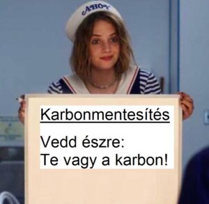 Dekarbonizáció? Karbonmentesítés, karbonsemlegesség? Ezerrel rohanunk az alagútba, ahonnan nincs visszaút, csak kőkorszak és jobb esetben örökös rabszolgaság, ahol a rabszolgatartók azok a népek lesznek, amelyek ma nem vevők a klímahisztériára. Rosszabb esetben karbonmentesítés a csinos hölgy által tartott tábla szerint. Ébresztő politikusok, ébresztő állampolgárok!